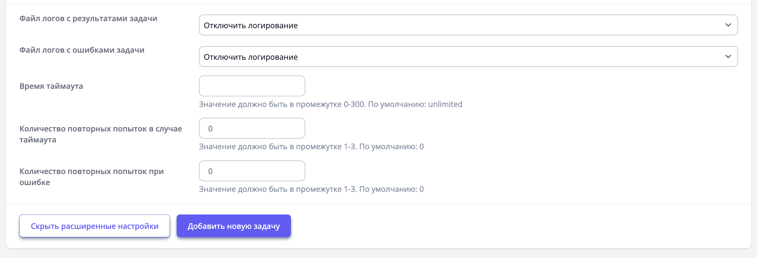 Таймаут — ограничивает максимальное время работы задачи (по умолчанию: без ограничений, максимум: 300 сек);