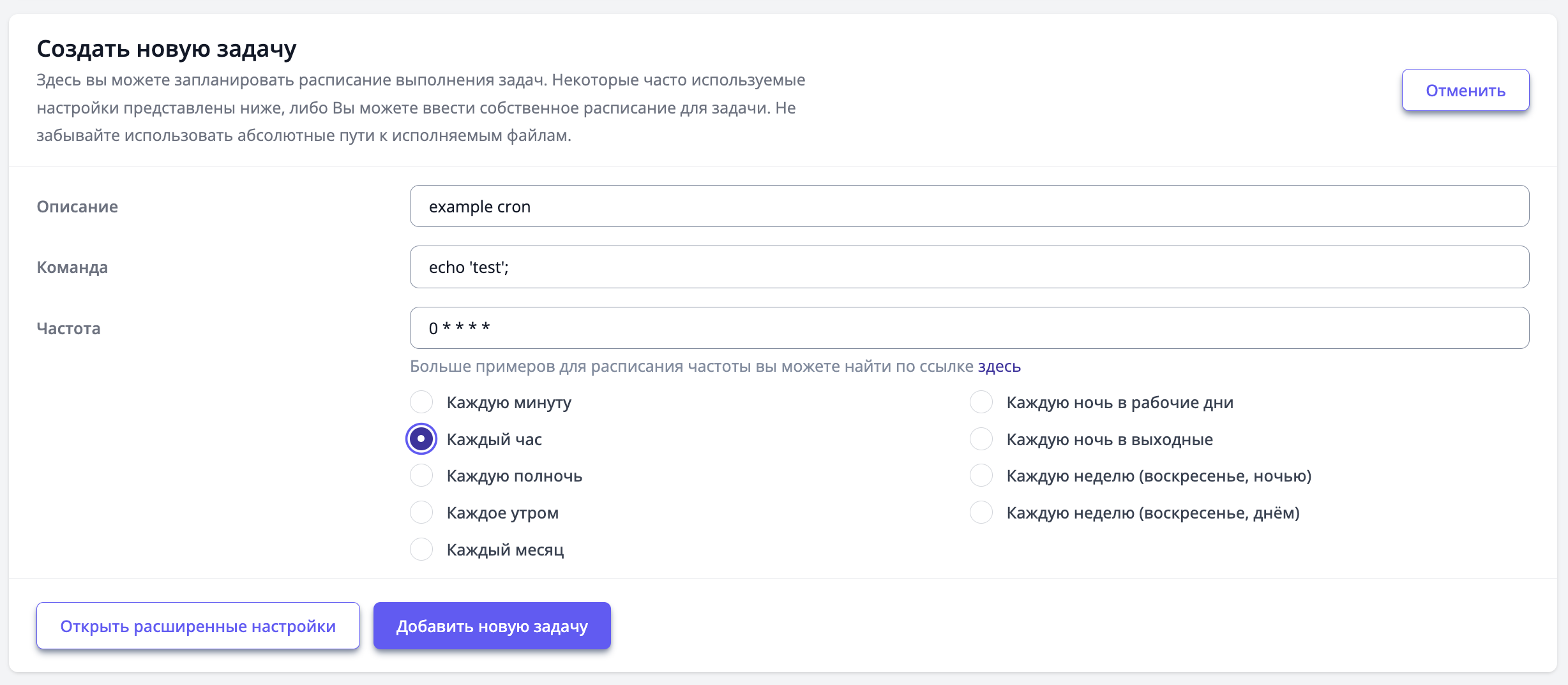 - Частота выполнения — выберите шаблон или задайте кастомный интервал.