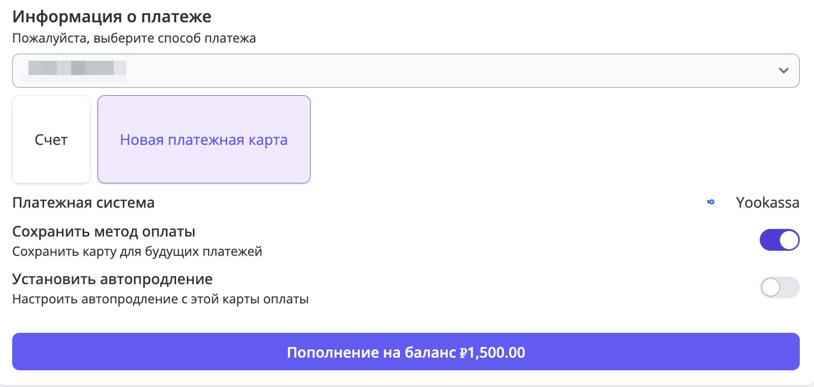 - Способ оплаты: сохраненный платежный метод, баланс аккаунта или платежный провайдер (например, Юкасса или Счет).