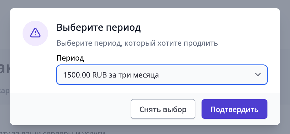 Открывается модальное окно для выбора периода оплаты (аналогично продлению сервера, но вы не можете отменить выбор сервера — только выбрать период и подтвердить).