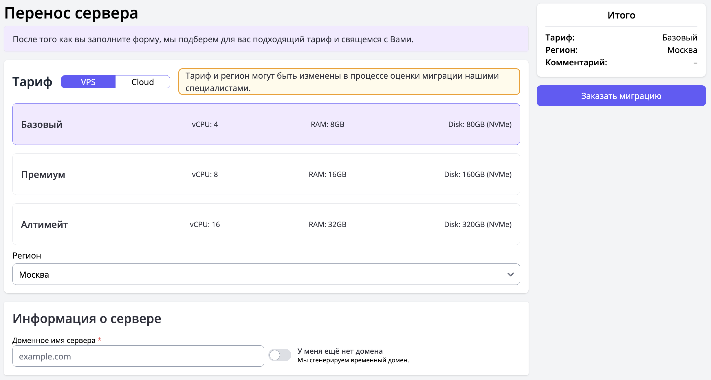 Оплата сервера при миграции становится доступной только после согласования тарифа и подтверждения миграции. После создания услуги для сервера в списке серверов вашего проекта появляется иконка для перехода к оплате.