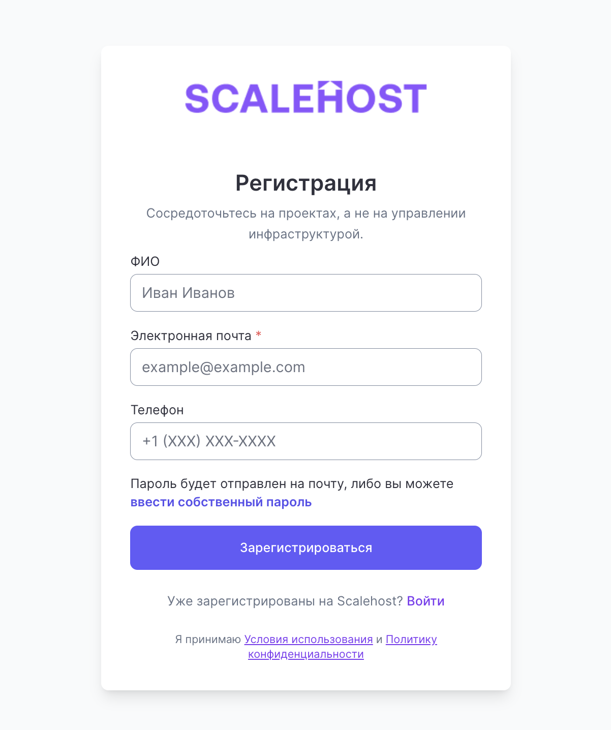 После отправки формы мы проверим, не связан ли указанный вами email с уже существующим аккаунтом. Пароль должен быть длиной более 8 символов и содержать хотя бы одну цифру, одну букву в нижнем регистре и одну букву в верхнем регистре.