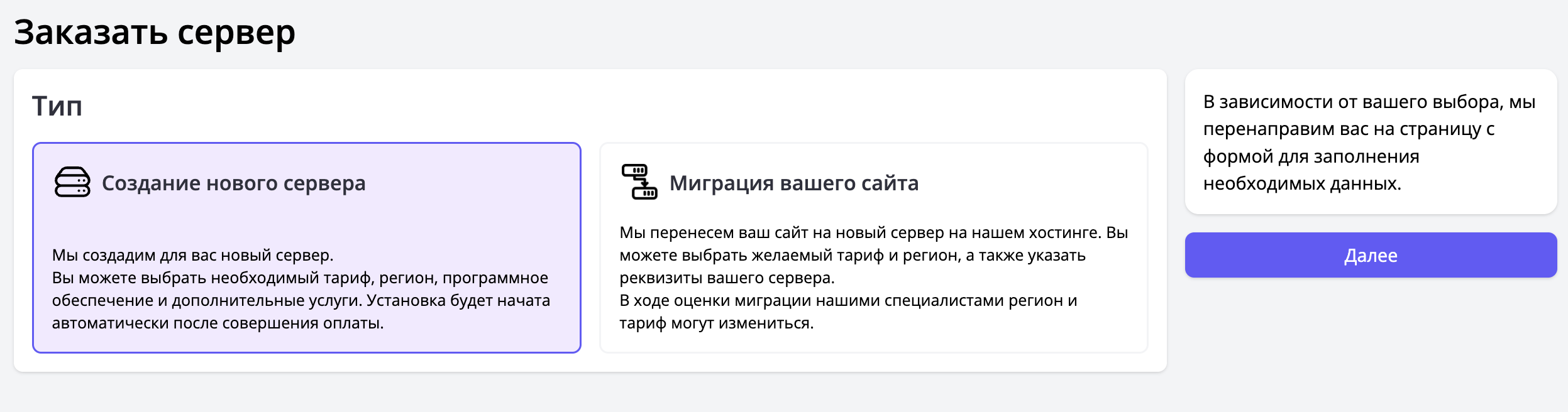 После нажатия кнопки заказа, откроется форма, которая позволяет выбрать, какую именно услугу вы бы хотели заказать: новый сервер или миграция вашего сайта. Этот раздел документации подробно описывает создание сервера. Ознакомиться с процессом миграции вы можете в этой статье.