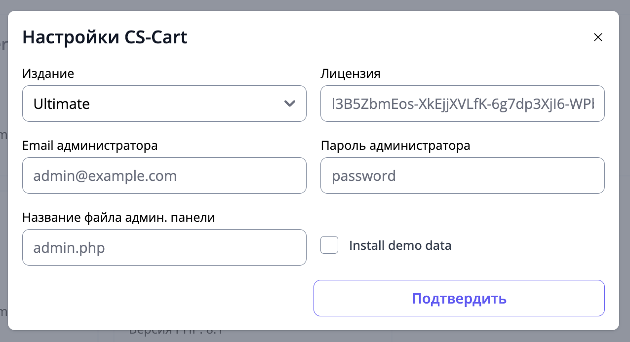Кликнув по карточке с ПО, которое вы хотите установить, вы также можете изменить настройки самой CMS, кликнув по названию или иконку "шестеренки" справа от него. Вы можете изменить доступы к административной панели, задать свой путь к ней, установить дополнительные плагины. Список настроек зависит от того, какую CMS вы выбрали.