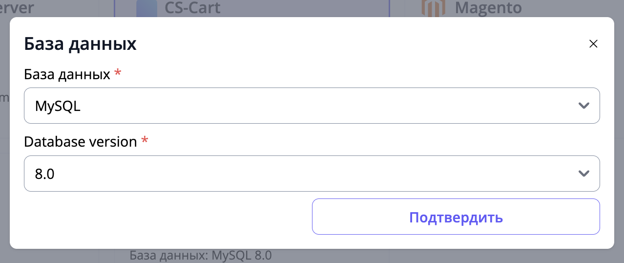 Вы также можете конфигурировать тип и версию системы управления базой данных, кликнув по названию или иконке "шестеренки" внутри карточки с ПО. Доступны следующие версии типы СУБД.