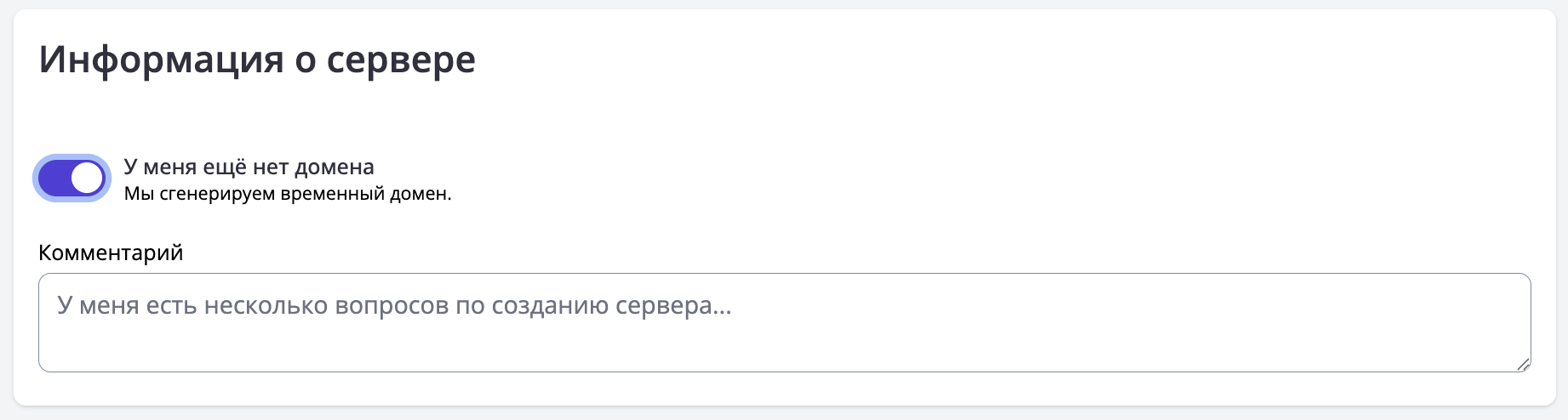 Вы можете закрепить за своим сервером доменное имя или сгенерировать его, выбрав опцию "У меня еще нет домена".