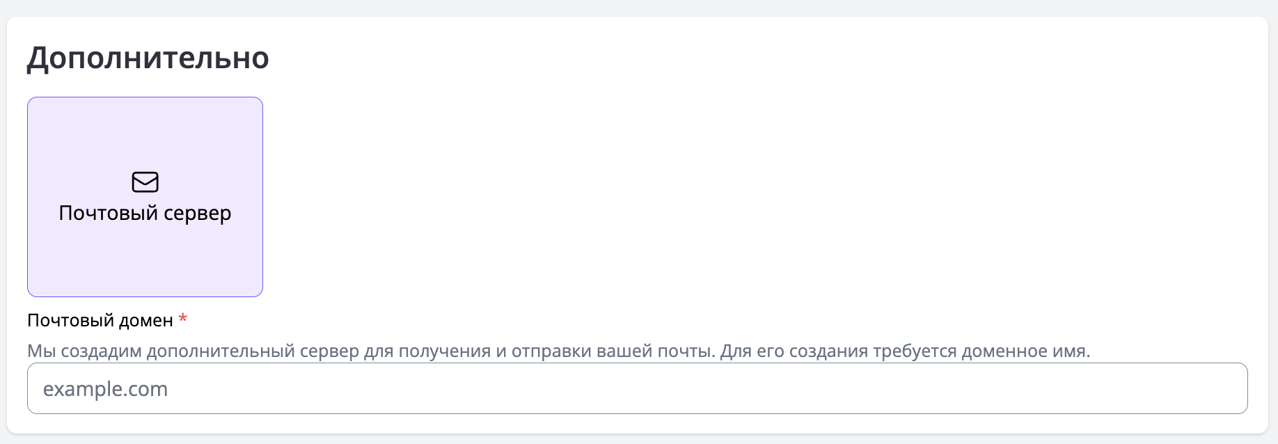 Для интеграции почтовых уведомлений с сайта можно подключить почтовый сервер, указав домен рассылки. Для создания этой услуги необходимо доменное имя, с которого вы планируете отправлять уведомления с сайта.
