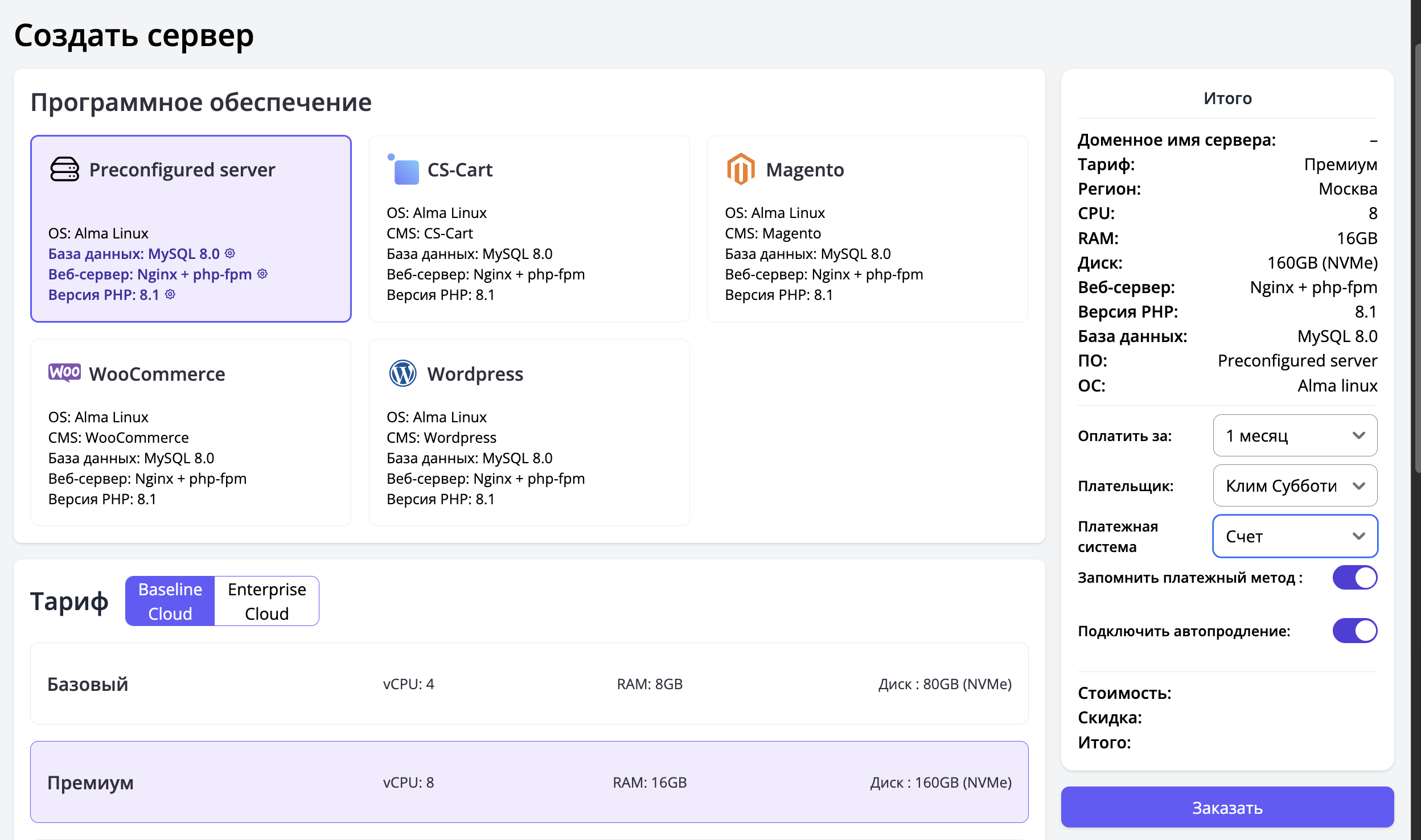- Вы вводите детали сервера (домен, регион, тариф), выбираете сохраненный платежный метод и подтверждаете заказ.