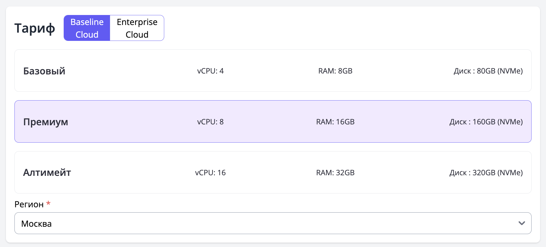 В разделе выбора и настройки тарифов вы можете выбрать вариант, подходящий для вашего бизнеса, а также указать регион.