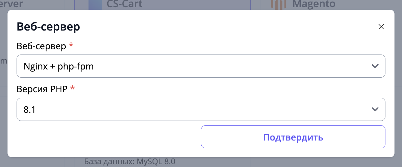 Дополнительно настраивается программная среда с выбором CMS: