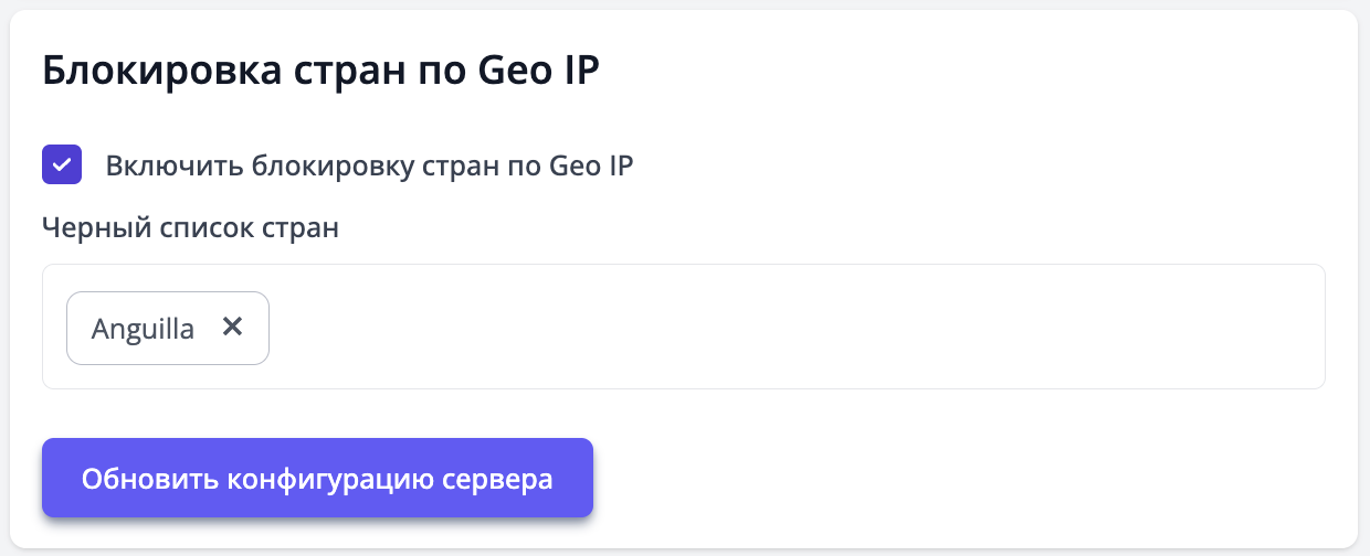 Заблокируйте посещение проекта пользователями из определенных стран благодаря функции Блокировки стран по Geo IP. Выберите нужные государства из списка — их трафик будет автоматически отклоняться на уровне сервера.