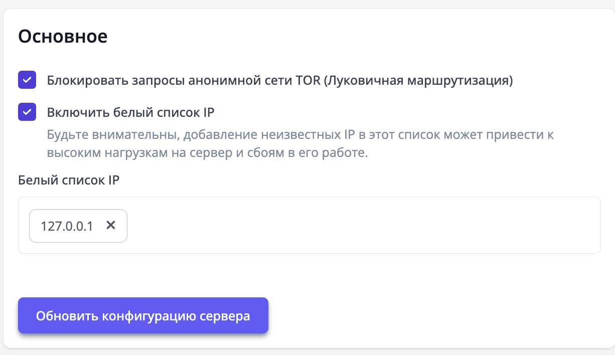 Отключают возможность подключения через анонимную сеть TOR. Также позволяет сформировать Белый список IP адресов. Добавьте доверенные адреса, чтобы исключить их из автоматических блокировок. Важно: некорректные настройки списка могут привести к нежелательной нагрузке на сервер из-за пропуска вредоносных запросов.