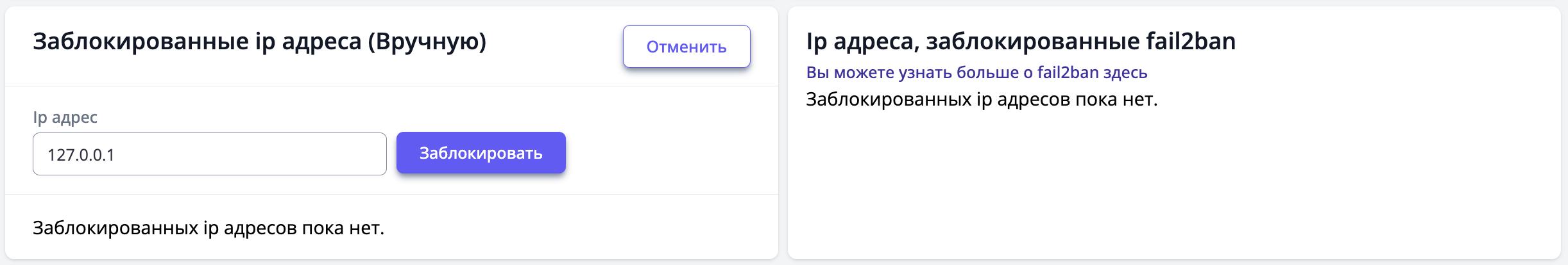 - Просматривать и корректировать список IP, автоматически заблокированных системой из-за подозрительной активности (например, множественные попытки входа), через анализ fail2ban.