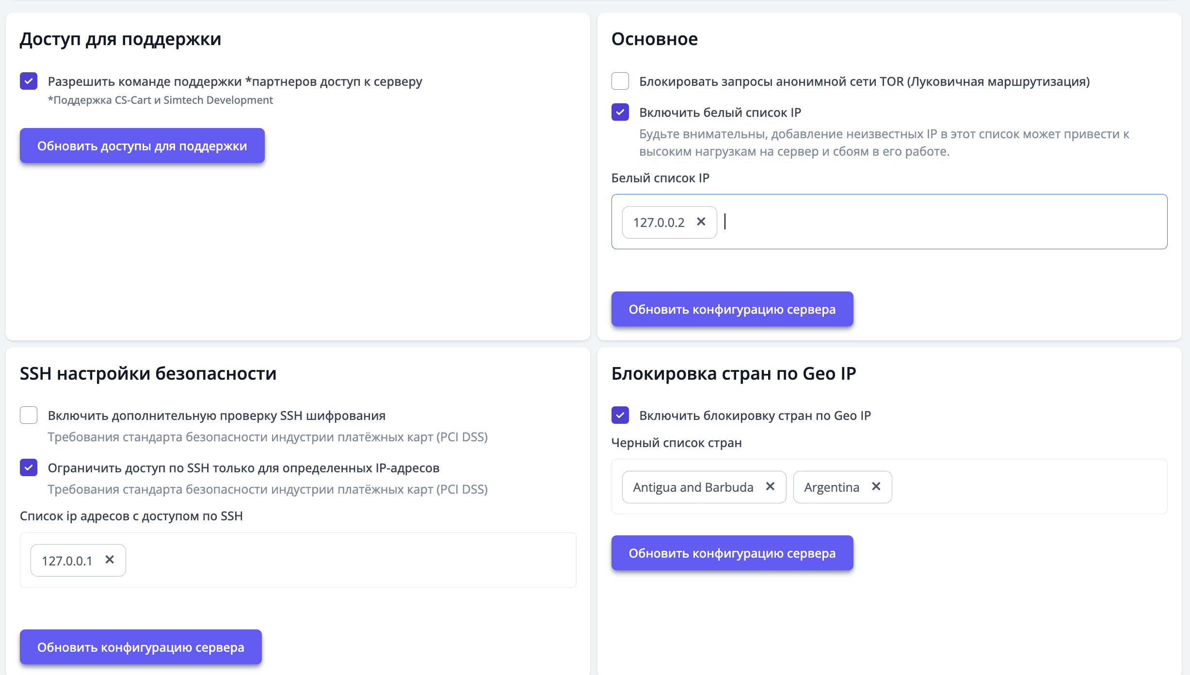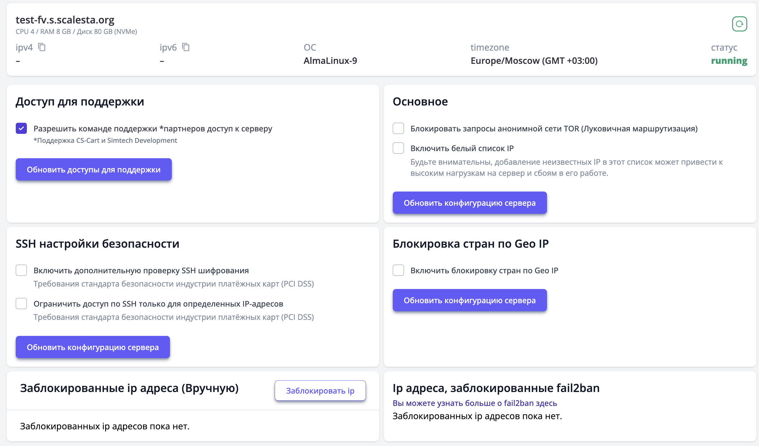 Раздел Безопасность предоставляет комплексный контроль над защитой инфраструктуры, включая гибкие инструменты фильтрации трафика и управление доступом сервера.
